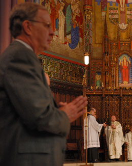 Students of the Diaconate Formation program of the Diocese of Salt Lake City gathered with their families Nov. 18 at the Cathedral of the Madeleine in Salt Lake City to celebrate the Rite of Candidacy, marking the beginning of the formal process that will lead toward ordination. Now in their second year of studies, the 22 men were reminded by Diocesan Administrator Msgr. J. Terrence Fitzgerald that, "Unfortunately, some deacons, some priests, some candidates even, can be tempted to think that ordination is an elevation to a grand position of honor; that people are to incense and genuflect in their recognition of us." Instead, he said, "Diaconate requires a very generous and humble service. Diaconate, like priesthood, is about Jesus Christ, his kingdom and his people, not about you, not about me." According to the Office of Diaconate Formation, this class of deacons is expected to be ordained in January, 2010. At left, Deacon Candidate Drew Petersen receives a blessing from Msgr. Fitzgerald. Below, Deacon Candidate Douglas Biediger processes out of the cathedral with his wife Virginia and their family.