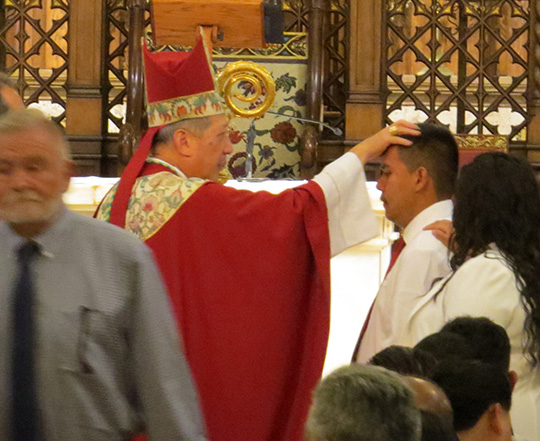 Posteriormente de que públicamente renovaron sus promesas bautismales y rea-firmaron si compromiso con la fe cristiana, uno por uno los candidatos para la Confirmación. Acompañados por sus padrinos, se pararon frente al Obispo, quien extendió su mano sobre cada uno, pidiéndole a Dios por el Espíritu Santo, Ungiendo a cada candidato en la frente con el Oleo Crismal el Obispo les dijo ‘reciban los dones del Espíritu Santo.”