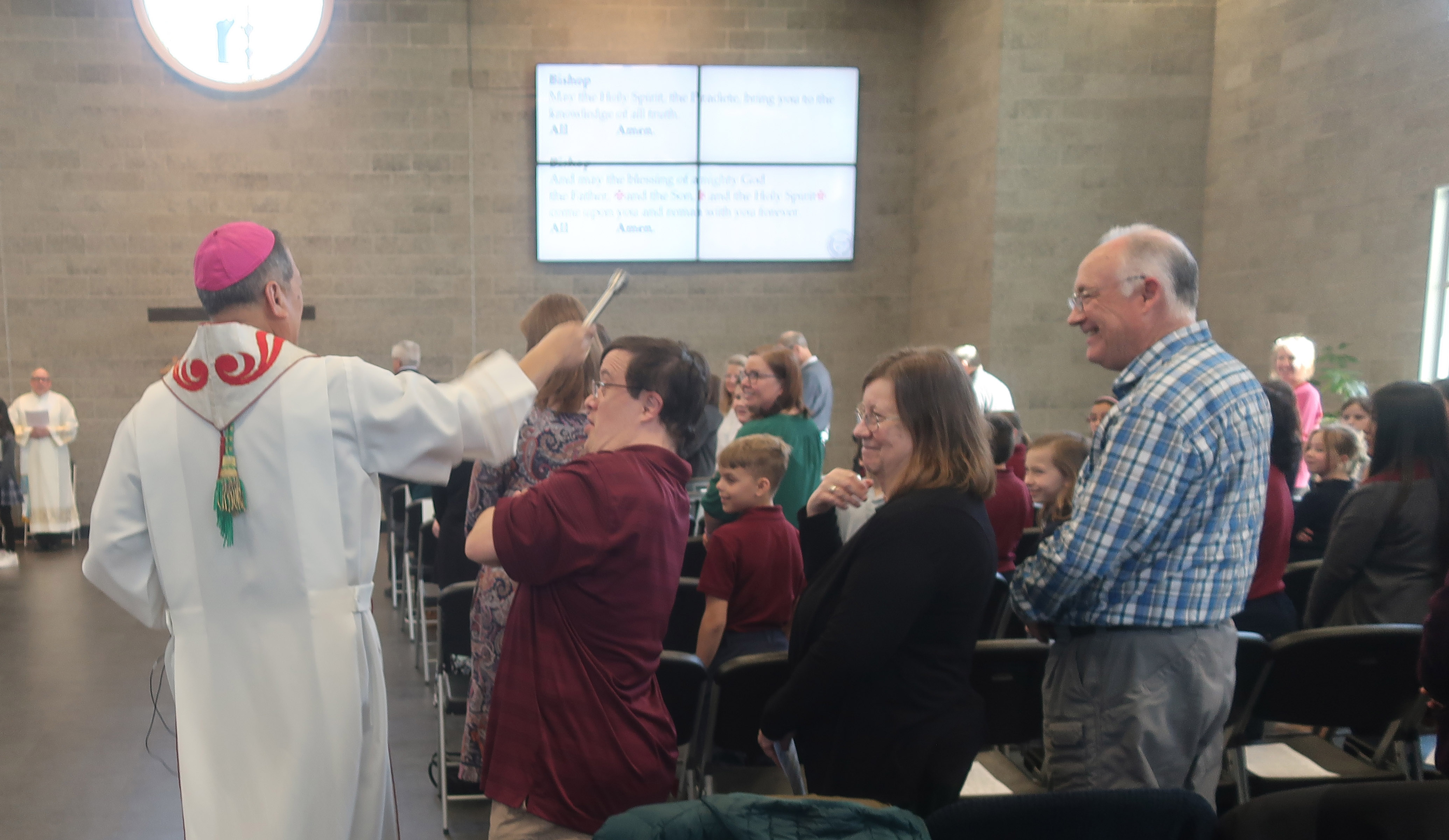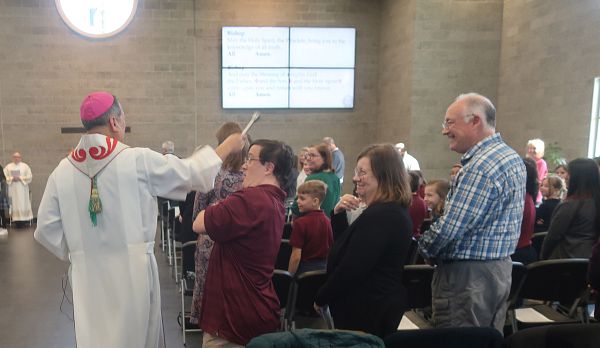 El 18 de marzo la comunidad de la escuela Católica de St. Olaf recibió al Ibispo Oscar A. Solis para juntos celebrar la dedicación de un nuevo edificio de 16,000 pies cuadrados que se anexó a la escuela. Aquí el Obispo Solis bendice el nuevo edificio sorprendiendo a uno de los asistentes a la celebración.