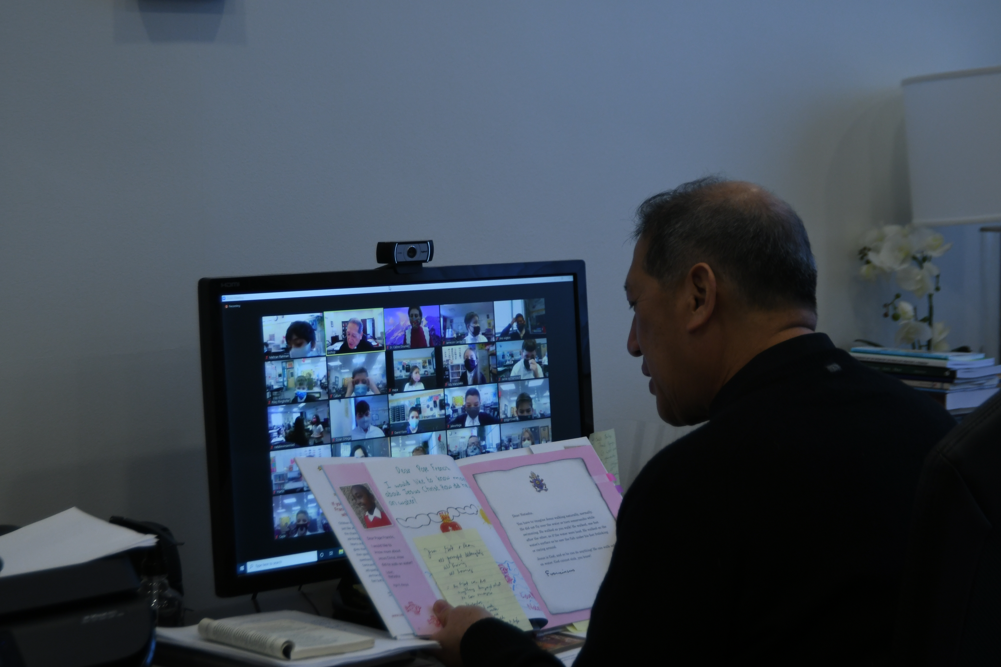 El Reverendísimo Oscar A. Solis, Obispo de Salt Lake City sorprendió a los alumnos de la escuela Católica de St. John the Baptist en Draper, siendo invitado a leer un libro.