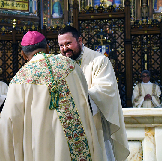 The newly ordained Father Anthony Shumway smiles at Bishop Oscar A. Solis at the end of the June 28 Rite of Ordination in the Cathedral of the Madeleine.