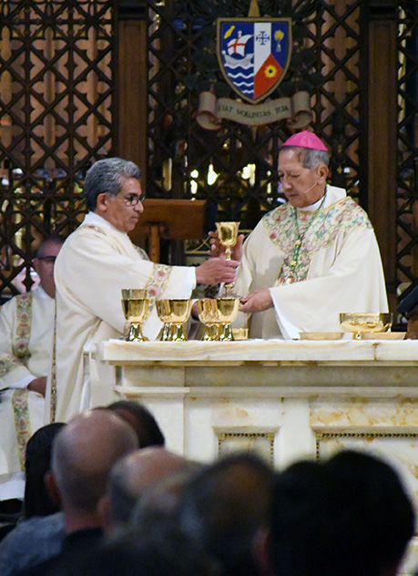 El diácono Odilón Jesse Ricardez asiste al Obispo Oscar A. Solis en el altar.