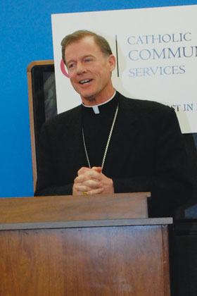 Catholic Community Services’ Salt Lake City office was the setting for the annual kick-off of the Pamela Atkinson Homeless Trust Fund (PAHTF). The Most Reverend John C. Wester, Bishop of the Diocese of Salt Lake City and Utah Governor Jon Huntsman were on hand along with Atkinson and Brad Drake, executive director of Catholic Community Services (CCS). "CCS is one of the most fabulous organizations that help the poor in this area," Atkinson, a community advocate said. "It’s where many of our homeless friends get help." Atkinson thanked Dr. Dominic Albo, a member of the CCS Board of Trustees, for helping to raise money for the renovations that turned the former Intermountain Health Care Bryner Clinic into the current CCS facility. The PAHTF is a Hope for the Homeless program that encourages tax payers to donate to the fund by placing a check mark on line 27a of their state tax form, filling in the code requested, and writing in the amount they would like to donate. Atkinson said if every taxpayer donated $3 through their state tax forms, more than $1 million would be raised to help Utah’s homeless and most vulnerable population. The tax payers’ contributions to the PAHTF provides funding for the homeless service providers throughout the state with temporary shelter, meals, transitional housing, employment services, educational training, day care, home ownership training, and other programs for families in need of assistance. "It is my pleasure to help kick off the Pamela Atkinson Homeless Trust Fund," said Drake. "Atkinson gives wonderful support and guidance. No one has more energy or does more for the homeless." To illustrate that one person can make a significant difference, Drake told the story of 4th century Telemachus, who, with a full colosseum of people crying for blood, put himself between two fighting gladiators. He stopped the gladiators for a time, but was eventually killed. "From that day forward, people knew that one person can do something significant. "Checking the box on your state tax return means meals, case management, shelter, and food," Drake said. We are grateful for the PAHTF for helping us resettle more than 500 refugees and provide treatment services for homeless men, services for women and children. But case management can’t do it alone. We need love, compassion, hope, and collaboration with other service organizations. With that collaboration, we can literally save lives. Client Troy Loving said his life was heavily affected by cluster headaches. He’d lost his job and his home. "I ended up in the bus station, the overflow shelter, and the Road Home. It was a never ending situation. But I found Catholic Community Services. They lifted my spirits. CCS has been my biggest help. Atkinson said her goal is to end chronic homelessness in the next 10 years. She said efforts by former Salt Lake City Mayor Palmer DePaulis and Gordon Walker will help the city achieve that goal. Bishop Wester thanked those who support CCS, and welcomed everyone to the kick-off celebration. He told the story of stepping into a chapel to pray after a long day in San Francisco. He notice there a "homeless gentleman" known by most as Carnation Charlie. Not thinking, Bishop Wester, (who was a priest at the time) sent Charlie out of the chapel because he was disturbing his prayer. "Since then I have learned that homeless people are everybody’s guest. They live in urgent situations. I think it’s significant to say that Charlie stepped into a church, a synagogue, or a mosque, because the people there would be present to him and help him. "You and I have to be that presence to others. I can put a check mark in that box. I’m just one person and I can make that difference. "I don’t know if Charlie is still alive; I doubt it. But I hope he found a home and people were present to him as he died." Atkinson said the bishop’s story stands as a reminder that homeless people have names. She told they story of her friend Bobby Fritz, who died recently. "Bobby was looking for a better life. He was looking for someone who would take some interest in him, give him respect and self-esteem. Governor Huntsman called Atkinson the "heart and soul’ of this community. He said he has two children who attend Catholic schools, where they have learned that unity is important. "We all must be each others’ keepers," Huntsman said. "All suffering must be eradicated. The governor spoke of his daughter, Gracie, 9, a native of China, who spends a lot of time on the internet. She recently showed her father that the higher the mountain a person climbs, fences and walls disappear. People become unified. "I think her observation was a very insightful lesson about beautiful people, some of whom suffer difficulties and hardships, but they look at their neighbors’ needs and they try to give them a little boost. "Now, as never before, we must lift ourselves up and life each other up," he said. "Pamela Atkinson is an expert at lifting others up. She is an expert in human behavior. She is one of those people we should all look up to." Atkinson spoke of CCS’s Refugee Resettlement Program, a streamlined process that brings people from all over the world, most recently from Burma (Mayanmar) and gives them safe passage, safety, and happiness here in Salt Lake City. They continue to make their services even better. It’s a huge humanitarian effort, they eventually have homes of their own. Atkinson also drew attention to Diocesan Vicar General Msgr. J. Terrence Fitzgerald, Dee Rowland, and Gordon Walker (director of community and culture) and Mrs. Walker, whose efforts have helped those in need.