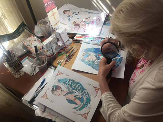 DRAPER – Diane Mecham sits at a card table, magnifying glass in hand, working for hours each day coloring what she calls her “angels,” – beautiful line drawings of angelic beings. Sometimes, for weeks on end theirs are the only faces that she sees.
