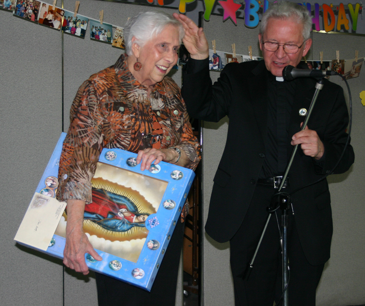 TAYLORSVILLE — Betty Yanni celebrated her 90th birthday with family and friends at a dinner party held in her honor at Saint Martin de Porres Parish April 20. "I’m not sure how I got to be 90; I’ve just lived my life," she said. "My faith has always been important to me." Father Jan Bednarz met Yanni in 2003 when he became pastor of St. Martin de Porres. "She is involved in everything," he said. "She was Woman of the Year, a member of the liturgical committee and on parish council, a women’s council officer, worked in RCIA, and she prepares the funeral lunches. When I call to tell her that somebody has died, she is always ready to help – she is a Martha. She also works at the soup kitchen and she is a Eucharistic minister. I really appreciate that she is a member of our parish and is so active. We wish for her that in 10 more years we will be celebrating her 100th birthday." Yanni was one of the founding members of St. Martin de Porres Parish in 1982. "If they ask for some help, I’m there," Yanni said. "I used to go to Saint Vincent Parish, but I came here when they built this parish to help get it established." Yanni’s friends say she has always been a hard worker, she is kind, thoughtful, generous and dedicated. "She’s a real joy to have in your life," said Marie Kane, who has known Yanni for more than 50 years. Merlene Wilson is Yanni’s backyard neighbor. They met in 1958 when Wilson put a statue of the Blessed Mother in her window sill when she first moved in and Yanni came over to ask if she was Catholic. "Our Blessed Mother brought us together and that’s why we’ve been dear friends ever since," said Wilson. "Her husband was my husband’s godfather and we’ve seen each other’s children grow up, and we’ve both had sons die." Yanni grew up in Salt Lake City, attended Holy Cross School of Nursing in Salt Lake City and worked at Holy Cross Hospital for many years before retiring. She married Ernie Yanni in 1946; he passed away in 1989. They had five children, who graduated from Judge Memorial Catholic High School. She has 14 grandchildren and "a lot of great-grandchildren," she said. Yanni’s daughters Roxanne Vaculin and Raelynne Jefferies shared some stories about their mother. "She made us go to church every Sunday," they said together. During Advent, the children attended Mass before school. "She cut our bangs way above our eyebrows for our school pictures," said Vaculin. "She would put Scotch tape across our forehead and cut, and if the tape moved, she would cut them crooked and cut higher," added Jefferies. Yanni is known by her family to try almost anything. "She will hike, and if she needs to, she’ll climb on one of the grandkids’ back and use it as a stepping stone," said Vaculin, laughing. "She slept in the tent and was a trooper for anything," added Jefferies. The daughters heard their mother was a daredevil when she was a teenager. "She would always get in trouble because if she was told not to do something she would do it anyway," said Vaculin. "Once when they were camping, they weren’t supposed to swim across the lake and she did. Our grandmother made her walk all the way around to get back. "She is a very special lady and everyone who called to say they were going to come to the party couldn’t say enough nice things about her," said Vaculin.