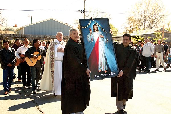 WEST VALLEY CITY — The Knights of Columbus led a procession following an image of Jesus with his rays of mercy at Saint Francis Xavier Parish April 15. The congregation sang "The Angels were singing and praising the Lord" in Spanish as they followed the image around the parking lot and into the chapel where they prayed the chaplet of Divine Mercy in English and Spanish. This was the first time St. Francis Xavier Parish has observed Divine Mercy Sunday and many came to receive God’s mercy. "Liturgically this is an important day and the parishioners really wanted this procession and devotion, especially our Hispanic people," said Deacon Doug Biediger. "This is a day of great grace; a day witnessed to by Saint Faustina Kowalska. According to her diary, Jesus told her that he would pour out his mercy on those who attended Mass, prayed the chaplet and received the Sacrament of Reconciliation. The chaplet is prayed at the hour of our Lord’s Great Mercy at 3 p.m., although it can be prayed at any time." The celebration for parishioner Armando Virgen was "wonderful," he said. "God showered his mercy on us." Parishioner Luc Gonzalez could feel God’s mercy in her heart, she said. "I’m so glad they had this celebration today." Parishioner Margarito Arellano had a wonderful experience and was still shaking after the celebration. "It was my first time and all the promises are really nice," he said. "It was a wonderful experience." It was also a new experience for parishioner Tim Briggs. "This was the first time I have prayed the Divine Mercy chaplet," he said. "I read in the brochure that the National Shrine is about 20 miles north of my hometown in Massachusetts. This experience left me with a real good feeling." "Be Apostles of the Divine Mercy" is the national Divine Mercy Sunday theme established by the National Shrine of Divine Mercy in Stockbridge, Mass. The message is to deepen our faith and go out and be apostles. "God’s mercy reaches out to the saint and the sinner and all in between," said the Most Rev. Timothy McDonnell, Bishop of Springfield, Mass., during the Mass on Divine Mercy Sunday at the National Shrine of Divine Mercy according to the website. In 1935, Saint Maria Faustina Kowalska of Poland received a vision of the Lord Jesus, who told her to paint the image she saw – Jesus with red and white rays of mercy extending from his heart. Later that same year she received another vision and began to pray for mercy, but her prayers were powerless. The next day as she entered the chapel of Our Lady of Mercy where she was a nun, she heard an interior voice instructing her how to recite the prayer that our Lord later called the Divine Mercy Chaplet. Saint Faustina, in obedience to her spiritual director, wrote a diary recording the revelations she received about God’s mercy. According to her diary, the message of Divine Mercy is that God loves us and he wants us to recognize that His mercy is greater than our sins, so that we will call upon Him with trust, receive His mercy, and let it flow through us to others; thus all will come to share His joy.