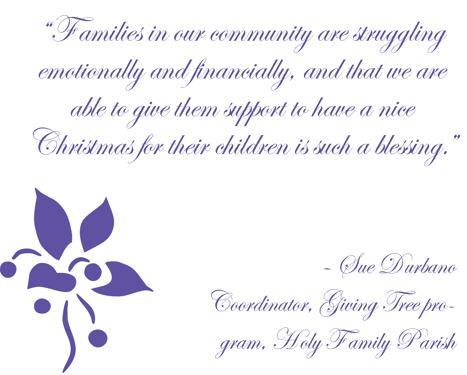 “We will be supporting 25 families, which include 76 children at GMAC,” said Sue Durbano, who coordinates the Giving Tree program at Holy Family Parish, adding that the parish is blessed to be able to offer this ministry. “Families in our community are struggling emotionally and financially, and that we are able to give them support to have a nice Christmas for their children is such a blessing.”