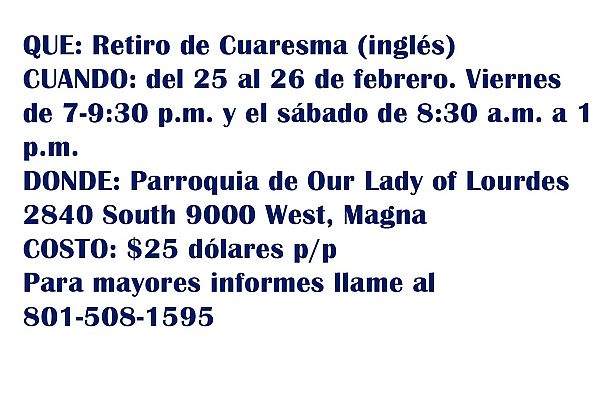 Después del 25 al 26 de febrero, la parroquia ofrecerá un retiro de Cuaresma en inglés. Los presentadores del mismo son el padre Vidal y Theresa Loy, directora de educación religiosa para adultos de la parroquia.