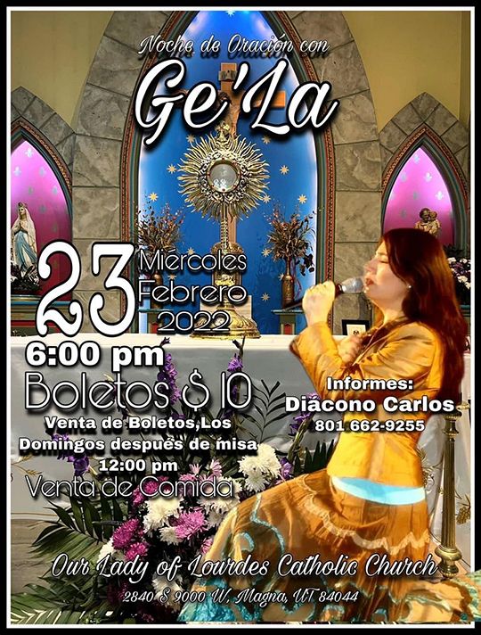 El miércoles 23 de febrero se realizará una noche de adoración con Angela Sandoval mejor conocida como Ge’La, una evangelizadora cristiana quien desde 1992 ha usado la música como un medio de sanación y de alabanza a Dios. Su ministerio la ha llevado por todo Estados Unidos asi como por México; también ha cantado en Guatemala, Nicaragua, Rep. Dominicana, Puerto Rico, Colombia, Perú, Israel, España, Roma, Canadá, El Salvador, y Honduras.