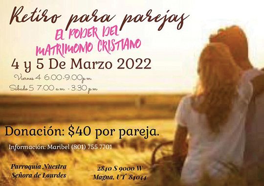 El tercer evento que se realizará en la parroquia se llevará a cabo del 4 al 5 de marzo. El retiro para parejas ‘El poder del Matrimonio Cristiano’ se realizará en español y su enfoque son los matrimonios. Los presentadores son dos matrimonios de la parroquia y el padre Vidal. El retiro comenzará con el Rosario seguido por la Santa Misa y algunas charlas.