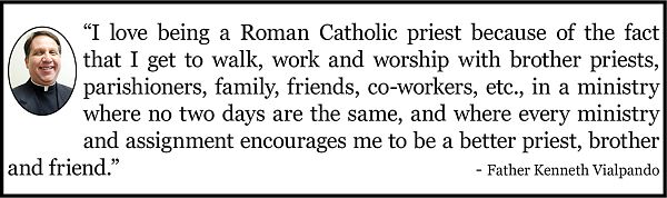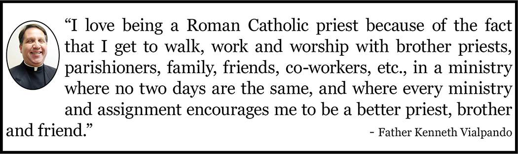 Fr. Vialpando truly believes the old saying that time flies when you’re having fun, particularly when you really love who you are and what you’re doing as a priest, he said. “I love being a Roman Catholic priest because of the fact that I get to walk, work and worship with brother priests, parishioners, family, friends, co-workers, etc., in a ministry where no two days are the same, and where every ministry and assignment encourages me to be a better priest, brother and friend.”