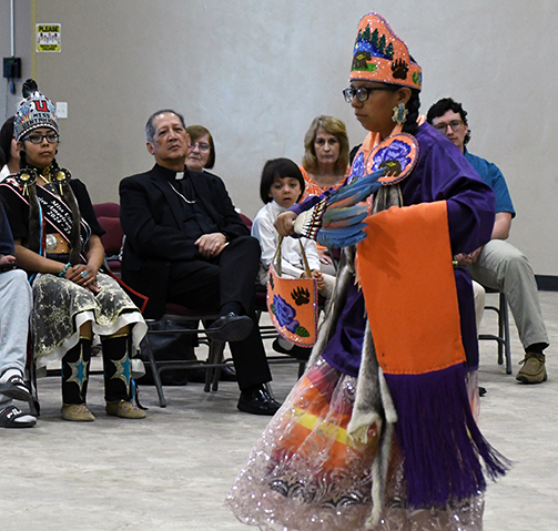 Bishop Oscar A. Solis presided at a Mass celebrating Saint Kateri Tekakwitha at her namesake mission in Fort Duchesne on July 10, in advance of her July 17 feast day. Concelebrating the Mass was Father Edward Leondhas, administrator of the mission as well as St. James the Greater and St. Helen parishes. Deacon George Reade proclaimed the Gospel. As part of the celebration, participants, some dressed in traditional clothing, processed from the mission to the Fort Duchesne Community Center, carrying an image of the saint and the banner with the mission’s name that was made for last year’s diocesan Eucharistic Revival celebration. Several members of the diocesan staff attended and, after the Mass, joined in a traditional round dance. Also as part of the celebration, three members of the Southern Ute Royalty spoke briefly and danced.