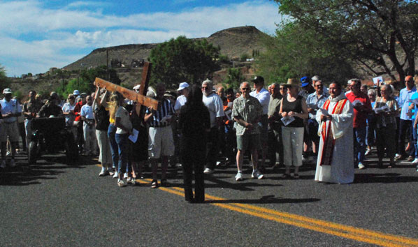 The red rock desert around St. George makes the perfect setting for an ecumenical Good Friday Way of the Cross. Planned by St. George Parish Pastor Father Gustavo Vidal for the first time last year, the Good Friday devotion drew about 300 people this year. The Way of the Cross began at the Bluff Street Park, and ended at St. George Catholic Church. IC photos by Barbara S. Lee