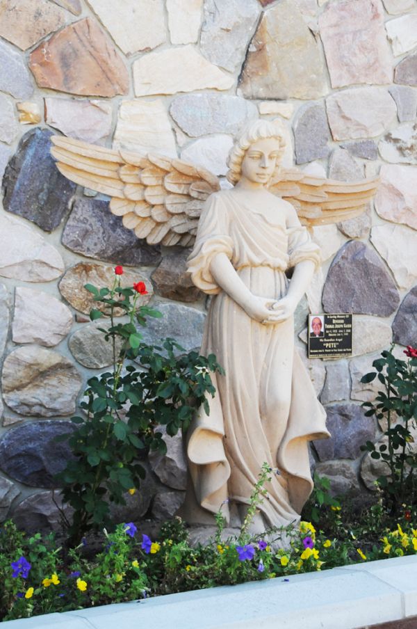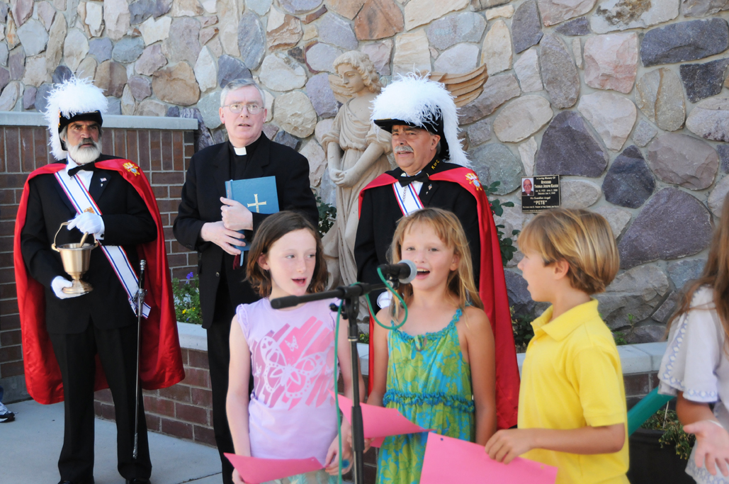 SALT LAKE CITY — Father Thomas Kaiser, who served as associate pastor at Saint Vincent de Paul Parish prior to his death in 2008, was fondly remembered Aug. 28 during a dedication ceremony for a statue depicting his guardian angel, Pete, shown at left. The statue was installed in a flower garden between the church and school with a plaque that reads "In loving memory of Rev. Thomas Joseph Kaiser, July 4, 1923 – April 5, 2008. Ordained June 4, 1949. His guardian "Pete" watching over St. Vincent de Paul School and Parish. Donated by St. Vincent de Paul Knights of Columbus, school and parish." The statue, which is about four feet tall, was handmade in Tonala, Mexico. Fr. Kaiser spoke often of Pete, and told unruly children that when they misbehaved, Pete would speak to their guardian angel. "Pete was his guardian angel who just hovered over him and hovered over everybody," said St. Vincent de Paul parishioner Michael Goleniewski, who was an altar server for Fr. Kaiser and considered him a mentor and surrogate grandfather. "He was so close to this parish. This was his home for such a long time." Among his memories of Fr. Kaiser is how, at Christmas Eve Mass, the priest "would invite all the kids to stand up and sing ‘Happy Birthday’ to Jesus," said Goleniewski, who joined the Knights of Columbus at Fr. Kaiser’s suggestion and now is a Fourth Degree Knight. At the dedication ceremony, Pam Grant said she loves and misses Fr. Kaiser. She was the coordinator for the 8 a.m. Mass, which Fr. Kaiser regularly celebrated. "He really deepened my faith in the Church," she said, adding that some of her favorite memories are that the priest had the religious education children gather for a rosary on May 1 and also at the end of the year. "Fr. Kaiser was very popular with the children at the school and, actually, with everybody," said Monsignor M. Francis Mannion, St. Vincent de Paul pastor. "We pray that Fr. Kaiser and the angel, which has been installed by the Knights of Columbus and by the school, will watch over Saint Vincent’s parishioners and also the students of St. Vincent’s school." After Msgr. Mannion blessed the statue, a group of children led by Scott Larrabee sang a song that Fr. Kaiser often sang: "Oh, How I Love Jesus."