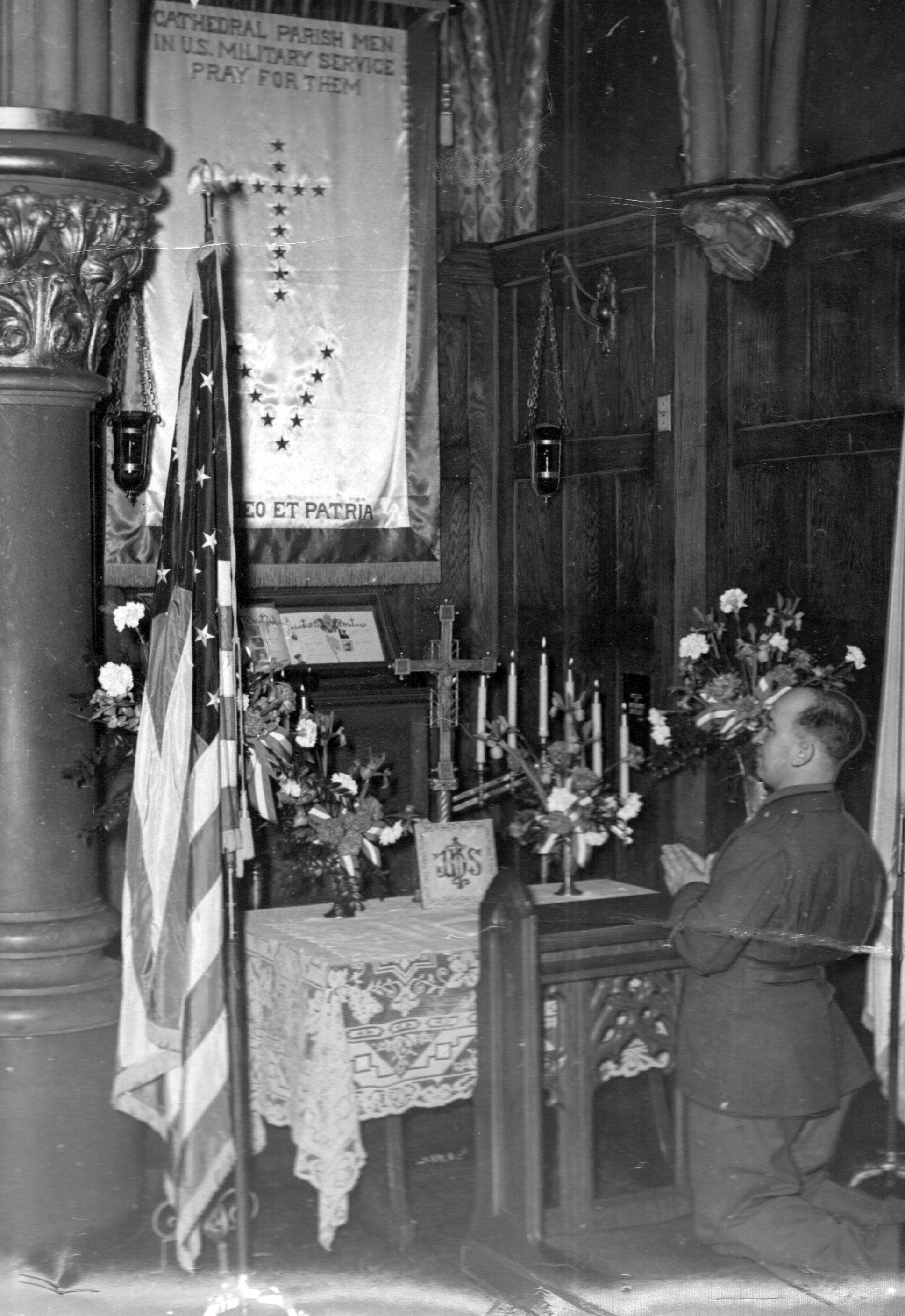 During this Jubilee Year of Hope, numerous groups are being honored. On Feb. 8-9, worldwide members of the armed forces, police and security personnel will gather in Rome to celebrate the Jubilee. Eighty-four years ago, U.S. President Franklin Delano Roosevelt declared war on Japan after the bombing of Pearl Harbor on Dec. 7, 1941. This marked the entry of the United States into World War II. To bring hope and solace to both military personnel and civilians, on March 7, 1943, the Most Rev. Duane G. Hunt, fifth Bishop of Salt Lake, dedicated a shrine in the Cathedral of the Madeleine “as a place of special prayer for the men and boys of the parish who are serving their country by land, sea or air.” Shown is Private Joseph Finster of Camp Kearns kneeling in prayer before the shrine shortly after its dedication.