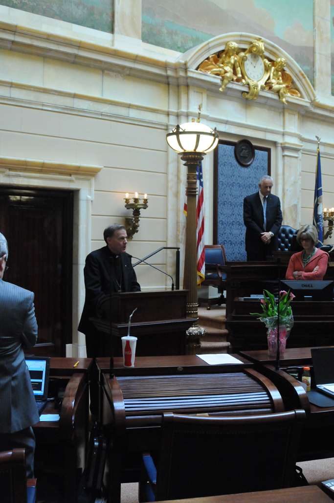 The Most Rev. John C. Wester, Bishop of Salt Lake City, (left), gives the opening prayer for the Utah State Senate on Feb. 17. Senate President Michael Waddoups, R - District 6, is shown on the right. IC photo/Jean Hill