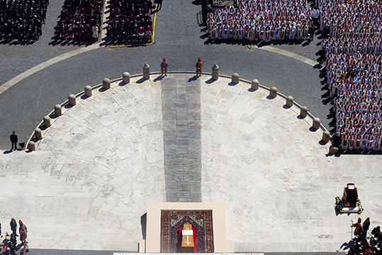 The casket of Pope Francis is seen from above during his funeral Mass in St. Peter’s Square at the Vatican April 26. Faithful, clergy and dignitaries gather to pay their final respects to the pontiff.