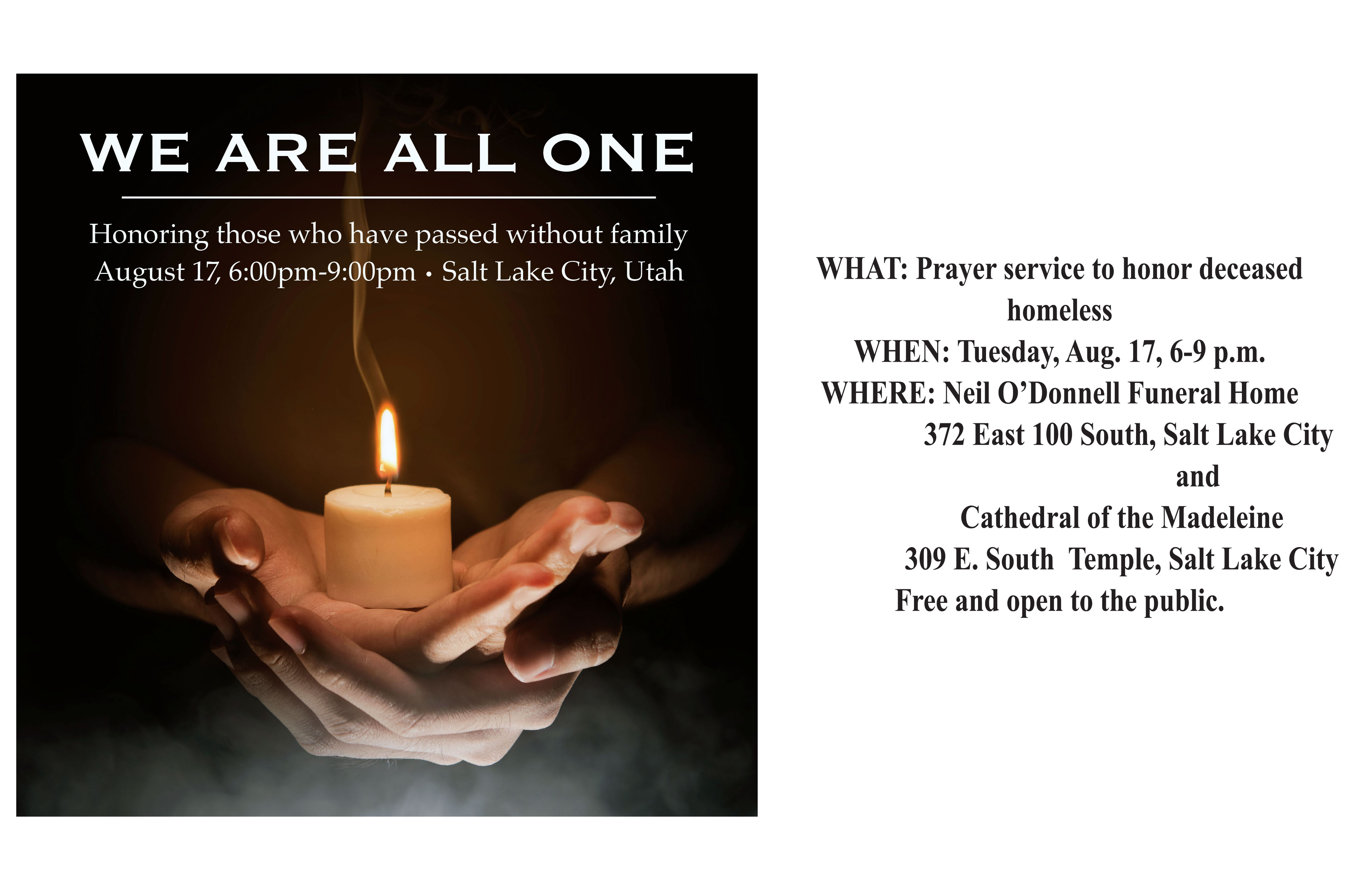 The We Are All One event will begin with a small reception and program at Neil O’Donnell’s. Participants will then walk to the Cathedral of the Madeleine, where Fr. Diaz will lead a prayer, the names of the deceased will be read, and the cathedral’s bells will be rung in their honor.
