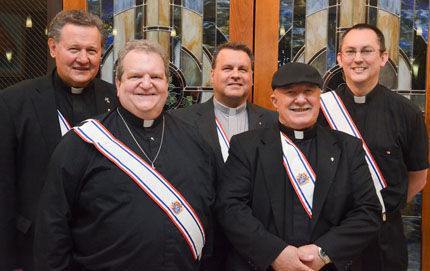 The Utah Knights of Columbus welcome new Fourth Degree Knights (from left) Deacon George Sluga of Saints Peter and Paul Parish, Deacon Dale Dillon of Saint John the Baptist Parish, Deacon John Kranz of Saint Thomas More Parish, Deacon Stan Stott of Saint Therese of the Child Jesus Parish and Father John Evans, pastor of Saint Andrew Parish. Fr. Evans also is the new District Friar. The Degree ceremony was held at St. Thomas More Parish on May 30.