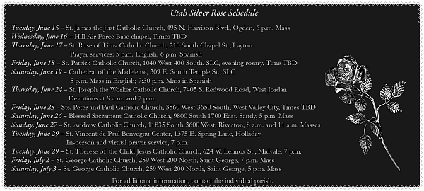 In Utah, each parish will celebrate a Mass and/or a bilingual (English and Spanish) prayer service and rosary, which will promote the dignity of all human life and honor Our Lady. There will be an opportunity afterward for veneration of the rose, which will be displayed on the altar.