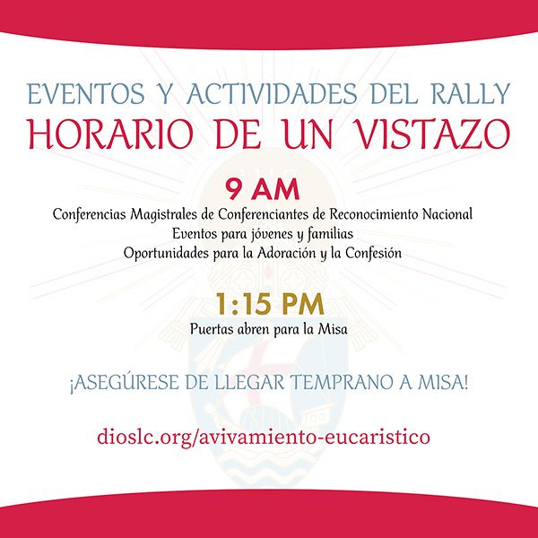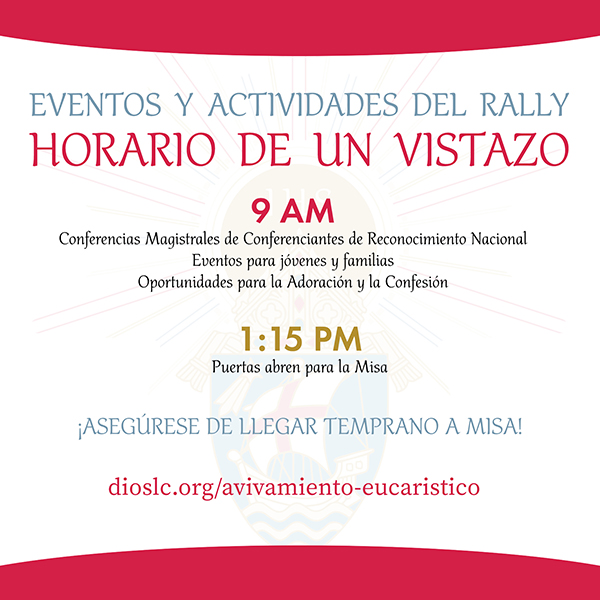 El Rally Eucarístico Diocesano y Misa se realizará el 9 de julio en el Centro Expositor Mountain América, ubicado en el 9575 State St., Sandy. El evento comenzará a las 9 a.m. con la oración de la mañana. La Adoración Eucarística y El Sacramento de Confesión estarán disponibles durante la mañana. El Obispo Daniel E. Flores de Brownsville, Texas será el encargado de ofrecer presentaciones en inglés y en español. El Dr. Timothy O’Malley ofrecerá una presentación especial en inglés y el Dr. José Medina presentará una en español. Los niños y jóvenes podrán disfrutar de varias actividades planeadas especialmente para ellos. Habrá un receso para el almuerzo, después las puertas se abrirán a la 1:25 para la Misa, la cual comenzará a las 2:00 p.m. y la cual estará presidida por el obispo Oscar A. Solis.