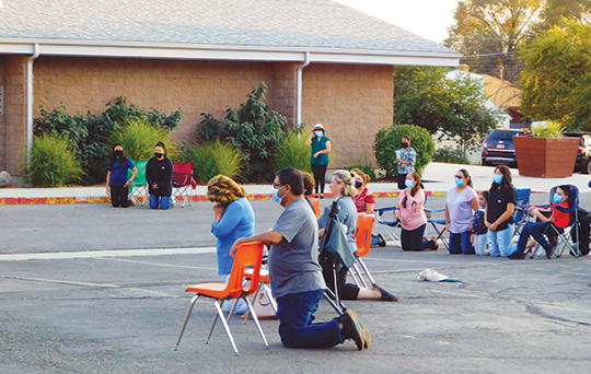 A pesar del calor los feligreses se arrodillaron, en el pavimento caliente, para orar por la salud y bienestar de los trabajadores de la salud y por las personas que están sirviendo al frente de la pandemia del COVID-19.