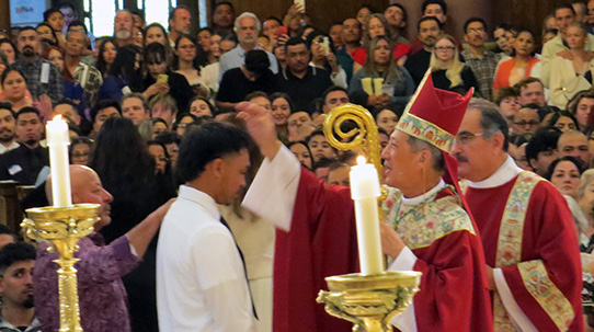 SALT LAKE CITY — Almost 400 adults from parishes and missions throughout Utah received the Sacrament of Confirmation from Bishop Oscar A. Solis at the Cathedral of the Madeleine on May 17, the largest number to be confirmed in a single Mass in the history of the Diocese of Salt Lake City. Another 120 are scheduled to be confirmed on June 14. Together, this is the largest group of confirmandi in the history of the Diocese of Salt Lake City, according to cathedral records.