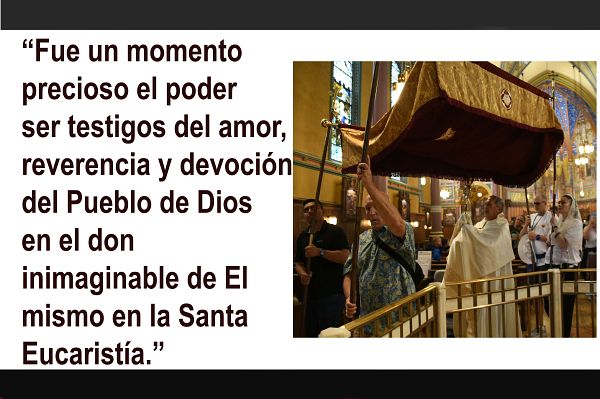 En la procesión la presencia de los fieles subrayaron la creencia fundamental de todos los católicos en la Eucaris-tía, el más grande sacramento y cúspide de nuestra vida Cristiana. Fue un momento precioso el poder ser testigos del amor, reverencia y devoción del Pueblo de Dios en el don inimaginable de El mismo en la Santa Eucaristía.