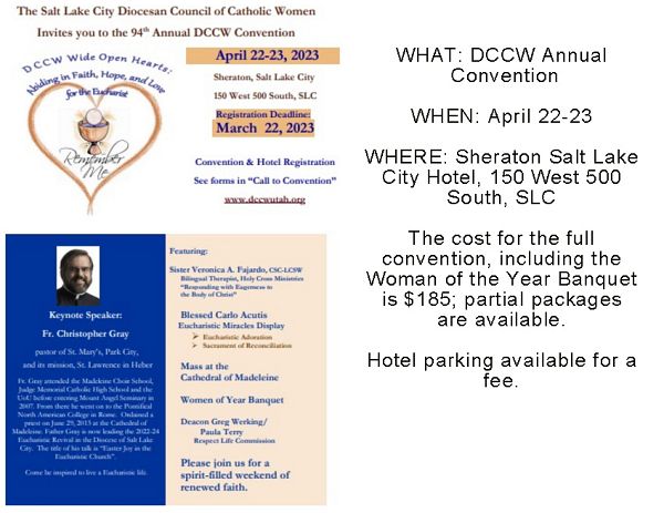 SALT LAKE CITY — The Diocesan Council of Catholic Women will hold its 2023 convention April 22-23 at the Sheraton Salt Lake City Hotel. “DCCW Wide Open Hearts: Abiding in Faith, Hope and Love for the Eucharist” is the theme for this year’s convention.