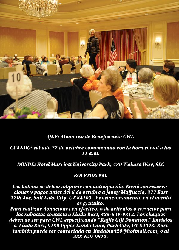 La CWL está solicitando apoyo para recolectar los artículos para las canastas que serán subastadas. Su lista de deseos incluye tarjetas de regalos para Cinemark y para tomar el té en el hotel Grand América, semillas para flores, juegos de mesa, manualidades para niños, obras de árte, pases para el Red Butte Gardens, Hogle Zoo y el museo de Historia Natural, entre otras cosas más. Todo debe de ser nuevo. Las donaciones económicas para las canastas también son bienvenidas. La fecha límite para las donaciones es el 5 de octubre.