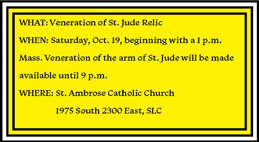 SALT LAKE CITY — Catholics in the Diocese of Salt Lake City will have the opportunity to venerate a relic of one of the 12 apostles on Oct. 19, when the Arm of Saint Jude Thaddeus will visit St. Ambrose Catholic Church. That day is the only time the relic is scheduled to be in Utah as part of a tour that is traveling to more than 100 cities in the United States.