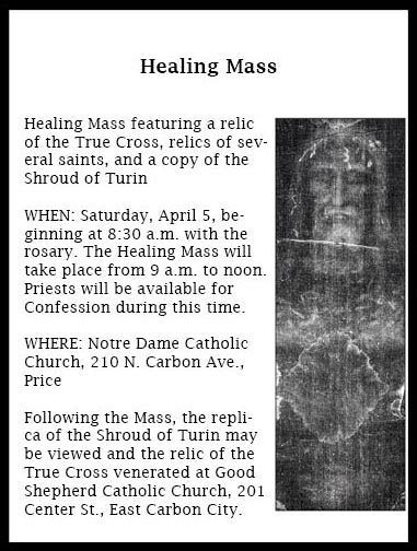 Following the Mass, the replica of the Shroud of Turin may be viewed and the relic of the True Cross venerated at Good Shepherd Catholic Church, 201 Center St., East Carbon City.