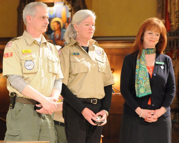 SALT LAKE CITY — Part of the mission of Cub Scouts, Brownies, Girl Scouts and Boy Scouts is to care for others and work to make their lives easier, qualities that also reflect Catholic values. They can earn formal recognition for learning more about their faith, and on Feb. 9, the Most Rev. John C. Wester, Bishop of Salt Lake City, honored Scouts who had earned religious emblems this year. "These awards that you receive today are symbols or signs of your care for others; that you don’t put yourselves first, but that you think of others and you wish to do for them, and to help them," Bishop Wester said during the annual Religious Emblems Award Ceremony, held at the Cathedral of the Madeleine. "Our diocese and our Catholic Church honor you today for your accomplishments because they’re a symbol of your care for others.... I want to be one of the first to congratulate you and tell you that we’re very proud of you and that we pray that you continue to do well." Among those who received awards were Girl Scout Sierra Bieling and Brownies Madison Burnham, Alexis Bean and Brook Milan Hartman from Saint John the Baptist Parish in Draper, who all received the Family of God award. The purpose of this award is for a scout to "discover the presence of God in her daily life," according to the manual for the award. "They’re the first to pioneer this [Family of God award] with Saint John the Baptist," said Christine Burnham, whose daughter is in the Brownie troop. For Sierra Bieling, who has been in scouting for three years, earning badges doesn’t top the list of why she continues to participate. Rather, "there are fun camps, and we help the community, and it’s really fun and you meet new friends," she said. Scout troops are an integral part of the youth activities at many parishes, including Blessed Sacrament in Sandy. "It’s an opportunity for them to relate to kids their own age and learn how to be part of a community," said Monsignor Robert Servatius, Blessed Sacrament pastor, adding that one of his priorities is to provide opportunities for youth of all ages so they can be involved in the parish. Parishioners respond well to the scouting programs, and "the kids seem to have a good time," Msgr. Servatius added. "A strong part of their scout experience is that they are, through whatever faith they belong to, to give some kind of service, and learn how important it is in their lives." Leadership skills also are stressed by the organization, said Cathleen Sparrow, CEO of Girl Scouts of Utah and a Saint Thomas More parishioner. "We firmly believe that if girls have good leadership skills starting at a very early age, as they grow up and face challenges and face difficulties, they will have confidence and courage within themselves and character; they’ll make better choices, they’ll make better decisions, they’ll think things through more effectively. They’ll also learn to stand up for themselves." At the ceremony, 26 Cub and Boy scouts from troops from Saint John the Baptist, Saint James the Just, and Saint Olaf parishes received the Parvouli Dei, Light of Christ or Ad Altare Dei awards. Also, three adult leaders were presented with the Bronze Pelican, a diocesan recognition given to scouts who have made a significant contribution to the Church and development of Catholic youth. The three were Sean Barbera, Megg Morin and Sparrow. Barbera "took over Troop 1966 at Blessed Sacrament two years ago and brought it back from the brink of extinction to one of the largest well organized Catholic Boy Scout troops in the GSLC (Greater Salt Lake Council)," according to the recognition. "His troop is the only one in the GSLC to offer the Ad Alteri Dei with any regularity. He truly lives the spirit of Catholic Boy Scouting and is one of those people you know you can just count on to be there when he is needed." Morin, who is Cub Master at St. Olaf Parish in Bountiful, "brings a very spiritual presence to Cub scouting, combined with humor and the ability to make difficult tasks fun," according to the nomination. "Her own den leaders could not say enough wonderful things about her and what she has brought to the Cub pack at St. Olaf’s." Sparrow "makes time for Catholic scouting and has been an active and avid supporter of Catholic Girl Scouting in Utah," according to the recognition. "She has been our keynote speaker at the Bishop’s Dinner on scouting and is an inspiration to all leaders in her message of building leaders in young women."
