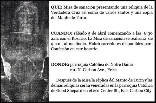 PRICE — Una Misa especial de sanación en la parroquia Notre Dame de Lourdes ofrecerá la oportunidad de venerar una re-liquia de la Verdadera Cruz así como las de varios santos, así como de una copia autentificada del Manto de Turín de la Basílica de Superga en Turín.