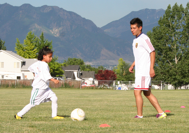 WEST JORDAN – Real Salt Lake team members presented for the first time a soccer clinic for the teams of different Catholic parishes in the new Father Carley sports field of Saint Joseph the Worker Catholic Church. Saul Garcia, who organizes the teams, said the July 6 clinic was possible through hard work and perseverance and that these type of events are very important to motivate the kids to become involved and stay involved in sports. "This is the first time (Real Salt Lake) has done a clinic for the Catholic community," said Garcia. "This time they are going to teach the kids how to play professional soccer, and one of the main players of RSL is going to be here with us, sharing time with the kids and giving autographs and taking pictures." This season about 250 kids are participating in different Catholic teams and some were left out because there were too many people interested in participating, Garcia said. The league has grown; it started just with the kids of the families of Saint Therese of the Child Jesus Parish, but now kids from different parishes and even non-Catholics have joined. Among the league sponsors are the University of Utah’s organ donation clinic, the Clinica Medica Familiar, some supermarkets and tax offices. This year, RSL offered its support. As a matter of fact, due to all the support they have received from RSL, 11 kids from the league will be escorted by RSL players onto the field for a Major League Soccer game against the New York Red Bulls on Aug. 6. "Our kids are also going to play a mini-game at the stadium during the half time of the game," said Garcia. The Catholic kids soccer league is named ‘Liga de Santa Teresita,’ honoring Father Martin Diaz, pastor of Saint Therese of the Child Jesus Parish, who has been a great support for them. The clinics conducted by the RSL Youth Soccer staff, players and coaches, are geared towards children ages 5-17. During the one at St. Joseph the Worker, the kids were divided into two groups: one for ages 5 to 10 and the other for 11- to 17-year-olds. "I’m very happy for all this," said Monica Hernandez, who took her son Martin to the clinic. "I love the fact that he does sports and I want him to keep doing it instead of playing video games or watching TV." During the clinic the kids learned how to prepare for a game, practiced control of the ball, coordination and speed. "These types of events are important to keep the kids busy in healthy activities so they are not just there wasting their time," said Nora Durazo, who learned about the clinic through the Internet. "We go to the Cathedral of the Madeleine, but I like to bring my kid to this league." During the clinic, Jamison Olave, the RSL defense player, appeared in the field and just in seconds he was surrounded by the kids and their parents, who made a line and waited for their turn to shake his hand, take a picture and get an autograph from the player. The Liga de Santa Teresita season finals will take place July 16, at noon on the Saint Joseph the Worker field.