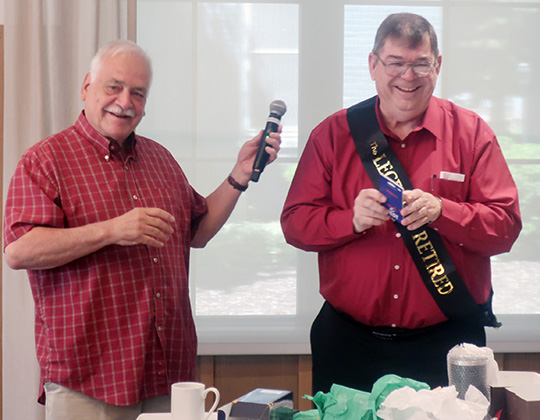 El padre Martin Diaz, presidente del comité litúrgico quien planeó el retiro y quien también es el rector de la Catedral de la Magdalena, presentó varios regalos a monseñor Bircumshaw, entre los cuales estaba un cubo de ideas de como pasar su tiempo en su jubilación y un traje de baño para ayudar a que esto sea una realidad.