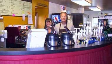 DRAPER — Sacred Grounds is a coffee shop, an ice cream parlor, and a great place for lunch. But it has become more, it is a gathering place for students, parishioners, community members, businessmen and women, and passers-by. The atmosphere is very peaceful and relaxing. It is off the beaten path in a setting which is out of the rapidly growing hustle and bustle of Draper City. Owners Bruce and Debbie Dahmen opened Sacred Grounds July 1, 2006. It is located at 12485 South 900 East, Draper. They are members of St. John the Baptist Parish, Draper. The name Sacred Grounds came about because it is located next to a cemetery. Debbie wanted to take a positive twist on the name and location of the coffee shop and combined the two ideas. "Once you come here and see the cemetery you put two and two together, and realize it is coffee grounds and burial grounds," said Debbie. "We convinced Draper City it was not meant to be offensive, it was simply good marketing and very memorable." Bruce and Debbie established the property as a wireless hot spot, which means people can come in without a phone jack and use their laptop computers to connect to the internet free of charge. "That is really nice," said Debbie. "The building next door used to be Draper City Hall, but it is now a Salt Lake Community College campus and a lot of the students come over here just to relax." Debbie is in the real estate business with her mother, Darlene Dippo. Debbie said the venture came about because their real estate office, Distinctive Properties, is located on the adjoining property to Sacred Grounds. "I approached the people who owned this property and mentioned to them if they were interested in selling, we would be interested in buying," said Debbie. "We basically bought the property for the land, sight unseen because it was so overgrown with trees, debris, chicken coops, and sheds, that even the neighbors did not realize there was a log cabin on the property. You could not see it from any angle. It was owned by Dr. Hugo Rodier, who was in holistic medicine. It was his home for a while, and then he rented it." After Bruce and Debbie purchased the property and started doing the cleanup, they began talking about how it would make such a cute coffee shop. As time went on, they decided to go for it. "It took us about a year and a half from making that decision to actually getting it approved through Draper City and opening the door," said Debbie. "We had a lot of time to learn the business because neither one of us had any type of background or experience in the coffee or food industry. So we received a lot of training in that year and a half before we were ready to open. Bruce was in the telecommunications business for more than 20 years, but quit his job to work in the coffee shop full time. Bruce and Debbie had to be trained in using all of the different types of commercial grinders, brewers, and steamers, as well as the ice cream equipment, and they learned how to prepare soups and sandwiches. They also offer pastries of all types that are delivered fresh four times each week. "We wanted to go with a local coffee bean roaster, so we did quite a bit of research," said Debbie. "When we toured the facility we use, we immediately fell in love with the owner. He started roasting coffee as a hobby in his garage, and decided to retire and take this up as a new career. His roasting business is a family-run business, and he has three warehouses here in town. They deliver beans to us at least once a week, usually twice a week so our coffee is incredibly fresh. "We do double shots of espresso in our small and medium size drinks, and four shots in our large drinks, which is quite different from a lot of the other coffee houses," said Debbie. "We also use real dairy whipped cream, and all fresh, high quality products including the Monin syrups." Before the weather turned cool, a friend of Debbie’s, Tamara Morton, who just cut a CD, came and sang outside on the grass along with a guitar player and drummer. "It was so wonderful because we actually had people who brought lawn chairs and just enjoyed listening to the music and being outside," said Debbie. "I am looking forward to doing that again next spring and summer on Sunday afternoons and featuring all different types of music for people to enjoy free of charge. "We are open seven days a week, and our hours change with the different seasons," said Debbie. "As of Dec. 1, we will be open weekdays from 7 a.m. to 5 p.m., Saturday, 8 a.m. to 5 p.m., and Sunday 9 a.m. to 4 p.m."