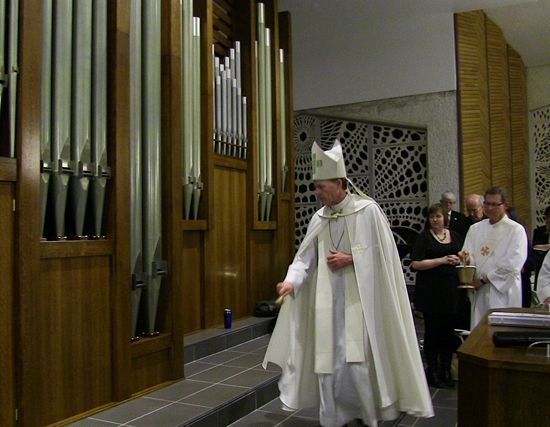SALT LAKE CITY — "Our church has lungs," said Father Andrzej Skrzypiec, pastor of Saint Ambrose Parish, with a wide smile at the end of the inaugural recital of the Roper Memorial Pipe Organ on Jan. 25. Hundreds of people attended the recital, which was preceded by Vespers and the blessing of the organ by the Most Rev. John C. Wester, Bishop of Salt Lake City. During his comments, Bishop Wester in particular thanked the donors who contributed specifically to obtain the organ for the parish, "to give glory and praise to God through the beauty of music," he said. An organ "is capable of echoing and expressing all the experiences of the human life," Fr. Skrzypiec said during his comments. "The manifold possibilities of the organ in some way remind us of the immensity and the magnificence of God.... May all those who enter this church be enriched by the solemn and beautiful music of this new organ and be brought to the joy of faith." The Roper Memorial Pipe Organ was created by merging the Holtkamp organ that previously had been at the Episcopal Cathedral Church of Saint Mark in Salt Lake City and St. Ambrose’s Wicks organ. The resulting instrument "has a wonderful clarity and a wonderful brilliance, which it brought from St. Mark’s" as well as "a breadth and warmth that it’s never had before," said Dr. Clay Christiansen, who performed the inaugural recital. "There are not a lot of instruments that have depth and breadth and warmth, and also have clarity. That’s one of the wonderful hallmarks of this great instrument, which not only has the power and the soft sounds but also has many charming sounds of all different varieties, and lots of color." Christiansen, a Mormon Tabernacle organist, spent 10 years as the organist and choir master at St. Mark’s, where he grew to love the Holtkamp. "This instrument finding a home was very close and near and dear to my heart because a decade of my life is tied up with it," he said. Each piece he played at the recital was selected to show off a different aspect of the new organ, he said. Just before the finale, from Sonata on Psalm 94 by Julius Reubke, Christiansen complimented Christopher Huntzinger, St. Ambrose’s music director, and said, "What a dream come true to see this wonderful organ here in a church with such a wonderful music program." The new organ is amazing, said Huntzinger, who was the organist for the Vespers service. "It’s like a small orchestra. It’s going to be very amazing for liturgies and for concerts. We have tons of different choices, ways to present the music. A hymn can be an event, not just a thing you do." In addition to being used during the liturgy and for concerts, the Roper Memorial organ will be a teaching instrument for students at J.E. Cosgriff Memorial School. "There are already some kids who have expressed an interest in becoming organists," Fr. Skrzypiec said. Two concerts have been planned for spring: April 28 with the choirs of St. Ambrose Parish and the Cathedral Church of Saint Mark; and June 7, with David Chamberlin, vice president/tonal director of M.L. Bigelow & Co., which built the Roper Memorial organ. Both concerts are scheduled for 7 p.m.