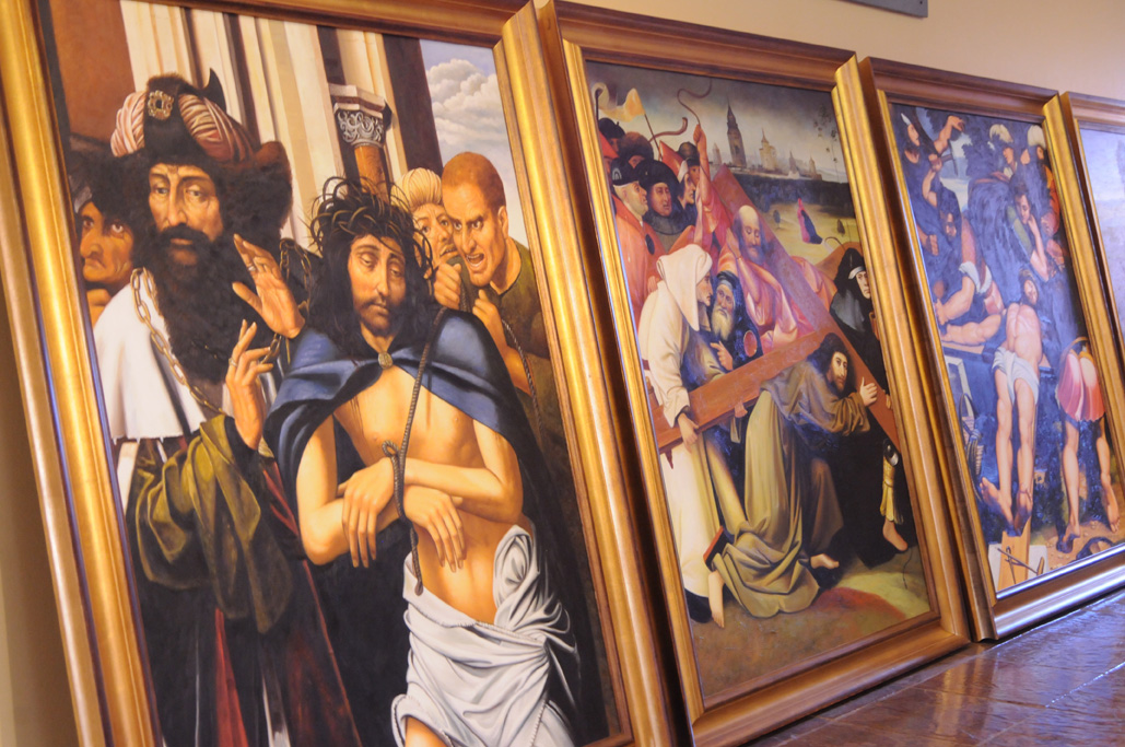 KEARNS – Saint Francis Xavier Catholic Church in Kearns will celebrate Lent with new Stations of the Cross. The stations, which were painted in China, are very detailed and reflect very well the Passion of Christ. "I spent many hours looking for images that could be used for the Stations of the Cross because it’s hard to find nice Stations of the Cross that would be big enough for here," said Father Robert T. Moriarty, St. Francis Xavier pastor. On the Internet, Fr.Moriarty found an island in China called the City of Art. "They paint anything you want," he said, so he sent his request for Stations of the Cross that reflect classical Renaissance paintings, each by a different artist. The new Stations arrived at St. Francis Xavier Parish as rolled canvases, "so I took them to the frame shop and they stretched them and they put the fancy frame around the edge," said the priest. All of the reproduction paintings were placed in 32 x 50 inch golden frames by Evergreen Framing Co. Each station was sponsored by a member or group of the parish: the Moriarty family, Doug and Ginni Biediger, Angie Krebs, Joyce Lay, Joyce Griggs, Marie Bertot, the Masse family, Michaela Jaques, Debbi and Andrew Archuletta, the Calishaw family, Jo and Eddie Springer, Tilly and Ernie Cordova, Jacquie and Steve Bergstrom, and the Craft Ladies. The paintings arrived before Christmas but were not ready to be installed until last week. Each one was hand painted in oil. They were installed on the walls of the church with the help of Deacon Rubel J. Salazar. "History is here," said Deacon Salazar, referring to the images. "For me there’s a lot of meaning here. Take, for instance, the one [image] of the Mother of Jesus. I have meditated and I looked at that. The way I see her expression is that her son is suffering, he is being tormented; she is sitting there, and the way that I see that expression is that, ‘Look what they are doing to my son!’ She carried all these things is her heart. It’s just touching." Fr. Moriarty said he is looking forward to celebrating Lent this year with the parish. "I am excited because we have about 150 people come to the stations every Friday during Lent in English and in Spanish, and the wall over there was so inadequate," said Fr. Moriarty, referring to the past wall with the Stations. "This gives us a better sense of the procession around the church and we are really excited about giving more art to our church something big and colorful and interesting."