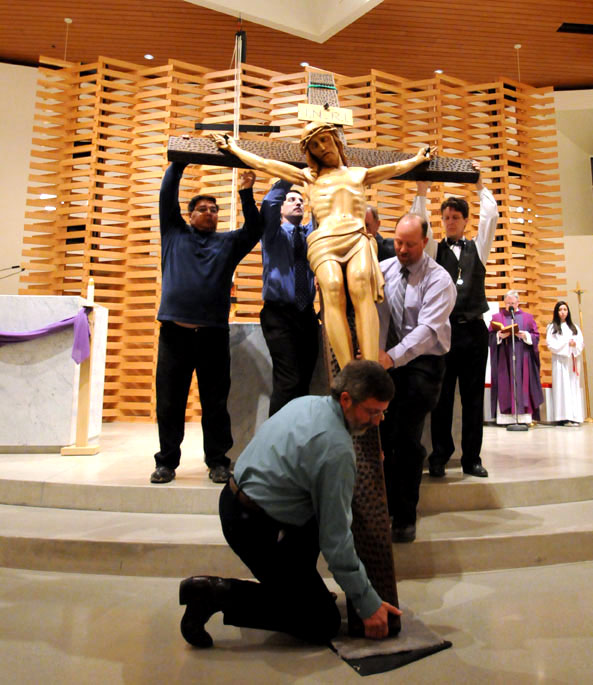 WEST JORDAN — Saint Joseph the Worker parishioners have been celebrating Mass in their new church in West Jordan for about three months now, but until Ash Wednesday no crucifix hung behind the altar. "Up to now there has been a very noticeable lack and many of the folk have expressed their uneasiness," said Father Patrick Carley, pastor. "They knew we were going to bring it in, but they kept asking ‘When are we going to bring it in? When are we going to bring it in?’ It’s our tradition’s most ancient and beloved symbol and no Catholic church would be complete or even feel Catholic to any of us without a crucifix. That’s the way we have been feeling. We like our (new) church, we think there are so many wonderful things about it, but without the crucifix hanging there we never felt complete." The empty space behind the altar was filled on Ash Wednesday, when men from the parish’s first generation carried into the new church a crucifix that had been in storage since the demolition of the old church. These were some of the same men who put the crucifix in place when the original church was built in 1964, Fr. Carley said. Once inside the new church, the men handed the crucifix to members of the younger generation, who carried it up to the sanctuary and hoisted it into place. "It’s all symbolizing the community coming together," Fr. Carley said. "The symbols themselves are nothing if they don’t build the Church."