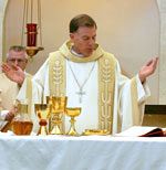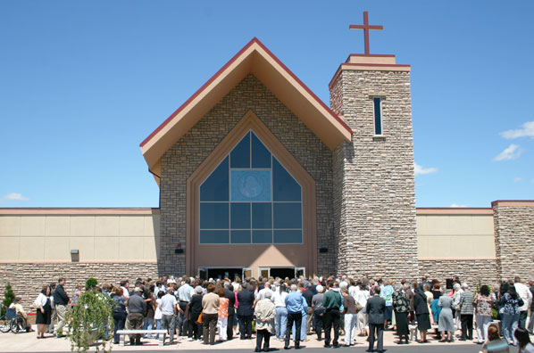 WEST HAVEN — "Saint Mary Church is a house that was built on faith, love, and resources by a community of Christ," said Dave Freston, Saint Mary building committee chairman at the Saint Mary Rite of Dedication June 8. "This is a house of love, a house of worship, a house of reverence, a house of education, and most importantly a house of God," said Freston, as Frankie Jo Freston handed the Most Rev. John C. Wester, Bishop of the Diocese of Salt Lake City, the ceremonial key to the new Saint Mary Church. The Frestons also presented a plaque to Bishop Wester for the Martin I. Rock Education Center. "We give thanks to this faith community, our pastors, the pastoral staff, the architects, the planners, and the builders," said Deacon Jack Clark of Saint Mary Parish. "We also thank Bishop George Niederauer, now Archbishop of San Francisco, Bishop John C. Wester, and Msgr. J. Terrence Fitzgerald, our vicar general," said Deacon Clark. "We give thanks to this faith community for their firm commitment to achieve this dream to have a new church strategically located in the heart of the community it serves." Jesuit Father Martin I. Rock, pastor of Saint Mary Parish, then came forward to open the doors. Bishop Wester concelebrated the Rite of Dedication Mass for Saint Mary Church with Msgr. Fitzgerald, Fr. Rock, and Jesuit Father Leo Prengaman. Jesuit Father Gerry Robinson, pastor of St. Ignatius Church in Sacramento, represented the California Provincial of the Jesuit Order. Clergy from throughout the diocese were also in attendance. Deacon Silvio Mayo, chancellor of the Diocese of Salt Lake City, Deacon Lynn Johnson, Bishop Wester’s master of ceremonies, Deacon Clark, and Deacon Steve Neveraski of Saint Mary Parish, assisted at the altar. Also in attendance were LDS Stake President Kirk Smith, other LDS dignitaries, West Haven Mayor Brian Melaney, and West Haven City council members. Bishop Wester said, "This is a day of rejoicing. We have come together to dedicate this church by offering within it the sacrifice of Christ." Bishop Wester blessed Saint Mary Church by sprinkling holy water on the altar, throughout the church, and blessed those assembled. Bishop Wester said, "the holy water is a sign of our repentance, a reminder of our baptism, and a symbol of the cleansing of these walls and this altar." Bishop Wester asked the saints to support our prayers to God the Father almighty, and anointed the altar with the holy oil blessed at the Chrism Mass. "We now anoint this altar and this building. May God make them holy, visible signs of the mystery of Christ and his Church," prayed Bishop Wester. Fr. Rock then blessed the walls of the church. Bishop Wester incensed the altar with the fragrance of Christ.Deacon Neveraski incensed the church. Deacon Neveraski then lit the candles and the lights were turned on to bring forth the light of Christ. Bishop Wester began the Liturgy of the Eucharist. "The building of our new church was all about faith," said Freston. "I cannot verbally express how divinely inspired this has been. "This church is a testament to our Lord, and it is a reflection of our parish community," said Freston. I think anyone who looks at this church can see that we thought hard constantly to wisely spend every dollar our parishioners ever gave us. We fought hard to preserve the heritage of this parish." St. Mary Parish began as Santa Maria Mission in May 1947, dedicated by Bishop Duane G. Hunt, then Bishop of the Diocese of Salt Lake City. Bishop Hunt entrusted Santa Maria Mission to Jesuit Father Louis E. Kern and appointed him the first pastor in 1954. St. Mary Parish was dedicated Sept. 8, 1957. The administration of St. Mary parish was entrusted to the Jesuit fathers and remains today. "It was our dream as we were building this church to have people gather to talk and laugh in the plaza outside the church," said Freston. "It came true today, and it came true when the second graders received their First Communion in May. Our attendance is up. We doubled our capacity and we are already filling our church. "Msgr. Fitzgerald and Archbishop Niederauer, when he was bishop, really never let us lose our faith in this project," said Freston. "They encouraged us to make our church bigger. They believed the future is in this area, and that is true. Only a few years ago this was farm fields owned by the first ever Saint Mary parishioners. "This community has been absolutely fantastic to us before we ever turned our first shovel of dirt," said Freston. "The building of the church has been such a parish-wide effort, and it is so gratifying to see so many people have ownership in it. This is a special day today."