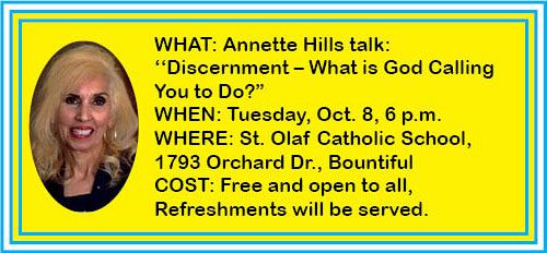 BOUNTIFUL — Annette Hills, a Catholic inspirational speaker and award-winning recording artist from California, will be at Saint Olaf Parish in Bountiful on Oct. 8.