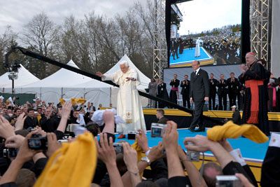 The sun was at its height as thousands of people stood and waited in growing excitement. The field behind St. Joseph Seminary in Yonkers, N.Y. was palpitating April 19 with the heightened emotions of 20,000 people – mostly high school and college students – vibrant with expectation. The pope was already on the way. Seminarians formed a small army of cassocks and roman collars near the stage. For two seminarians studying at Mount Angel Seminary in St. Benedict, Ore., for the Diocese of Salt Lake City, the Youth and Seminarian Rally during Pope Benedict’s apostolic visit to the United States was a unique opportunity more than simply to come together with an overwhelming presence of other men in priestly formation, but rather a microcosm of the Church in its fullness, from the faithful to the magisterium to the servant of the servants of God. Both from Salt Lake City, Joseph Frez, a second year theologian who just a few weeks before had received the ministry of acolyte, and I, a pre-theology student, were chosen by lottery from among the students in college and theology at Mount Angel Seminary to travel to New York for the papal visit. For some students, this was the furthest away from home they had ever been, and for others this was their first visit to a city as immense as New York. Staying at the headquarters for the Maryknoll fathers and brothers in Ossining, N.Y., this was also a first experience with foreign missionaries, a kind of vocation different from our own. We stood shoulder to shoulder for hours, waiting. It was Pope Benedict’s first time to the United States as pope; it was certainly our first time in the outward appearance of a cleric being in the presence of the pope. Together with seminarians from the dioceses of Denver, Philadelphia, Mexico, and elsewhere across the continent, as well as a smattering of religious orders, we shared stories of our seminary experiences, of our vocational journeys. We were united in our direction and purpose, solid in the conviction of our faith. As the hours passed and a litany of entertainers tried to woo the crowd whose hearts had already been given to someone else, seminarians responded with our own cheers of "Habebimus Papam" ("We will have the Pope") and choruses of the "Regina Coeli," the Marian hymn for the completion of the Divine Office. The chant swept over the field, with more seminarians joining every moment. Pope Benedict is a rock star. Following Christian rock superstars and American idols, he arrived at the seminary and entered the field to swelling counterpoint of Bach and the screaming cheers of thousands after personally greeting disabled children in the seminary chapel. The crowd’s expectation was fulfilled, the pope was present; the field erupted and would not relinquish the pope for several minutes of intense cheering. In his address, the theological reflection was deep and expansive. The ultimate truth is found in the ultimate being, he said, exciting every fiber of St. Thomas Aquinas’ philosophy among the seminarians – and all the people again broke out into shouts of joy. At the far-flung missions in the Diocese of Salt Lake City, where the celebration of the Mass can be a monthly luxury, the spiritual support of the Christian faithful, though strong, is minimal. The Body of Christ is integral always and everywhere, though the reinforcement of joining people en masse is a uniquely moving moment without which the experience of faith loses a critical taste of universality. The pope’s message has practical appeal to everyone. As Catholics, he said, we must foster our personal relationship with Christ, as well as be faithful to our liturgical prayer, work actively for charity, and be attentive to God’s call for each person: one’s vocation. The excitement that filled the day at its beginning became the vehicle for the pope’s words into the lives of everyone who listened to it. For seminarians, it was a first exposure as men in priestly formation to the fullness of the priesthood through the presence of the curia. From the desert of the Boneville Salt Flats to the center of every great city, this was a moment no one who experienced it will ever let go. Gray is a seminarian for the Diocese of Salt Lake City studying at Mount Angel Seminary, Oregon.