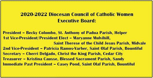 After postponing the 92nd DCCW Annual Convention from April 25-26 to July 25-26, then rescheduling it to April 17-18, 2021, the Salt Lake Diocesan Council of Catholic Women chose to vote online for their new officers. We are pleased to announce the members of the 2020-2022 DCCW Executive Board: