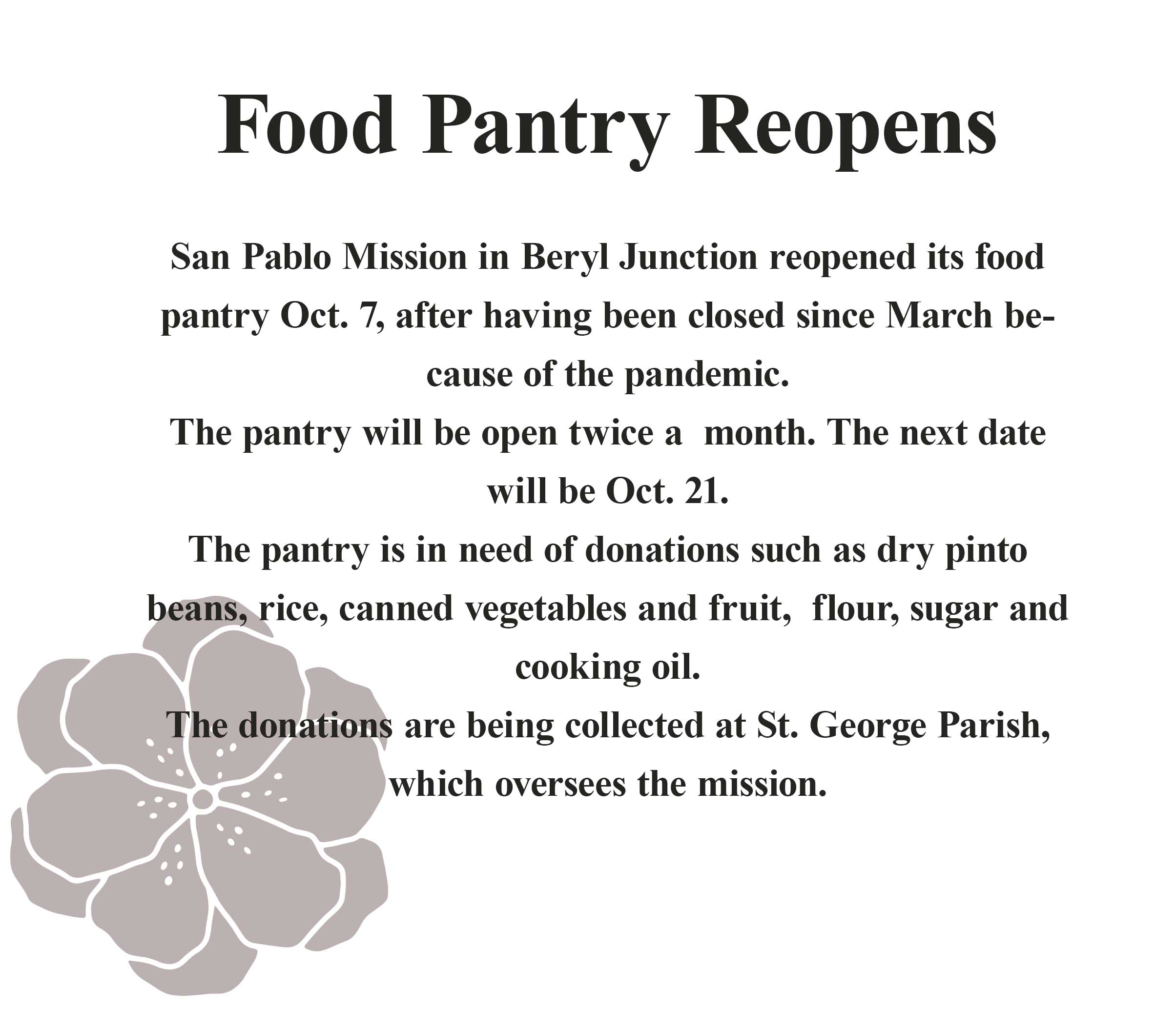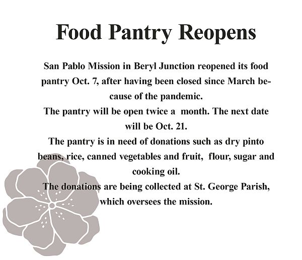 San Pablo Mission in Beryl Junction reopened its food pantry Oct. 7, after having been closed since March because of the pandemic.