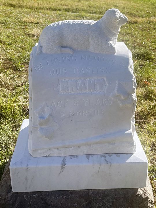 The marker is on the grave of Grant Keogh, who died at age 8 years and 5 months some time around the turn of the last century. Cemetery Director John Curtice estimates the stone was placed a couple of years after the cemetery opened in 1897.