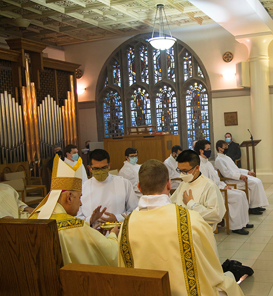 André Sicard, a seminarian for the Diocese of Salt Lake City, was instituted an acolyte on Feb. 22, the Feast of the Chair of St. Peter. Sicard is in his second year of theology at The National Seminary of the Catholic University of America in Washington, D.C. He was instituted an acolyte by Bishop Mario E. Dorsonville, auxiliary of Washington D.C., at the chapel of Theological College. Shown at right is Jonathan Pham, Theology I seminarian for the Diocese of Rockville Centre. Courtesy photo