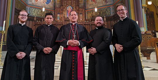 Bishop Oscar A. Solis is shown at the Chrism Mass with three of the diocesan seminarians - Tristan Dillon, Alberto Carrillo and Anthony Shumway - and Fr. Joseph Delka, director of the diocesan Office of Vocations.