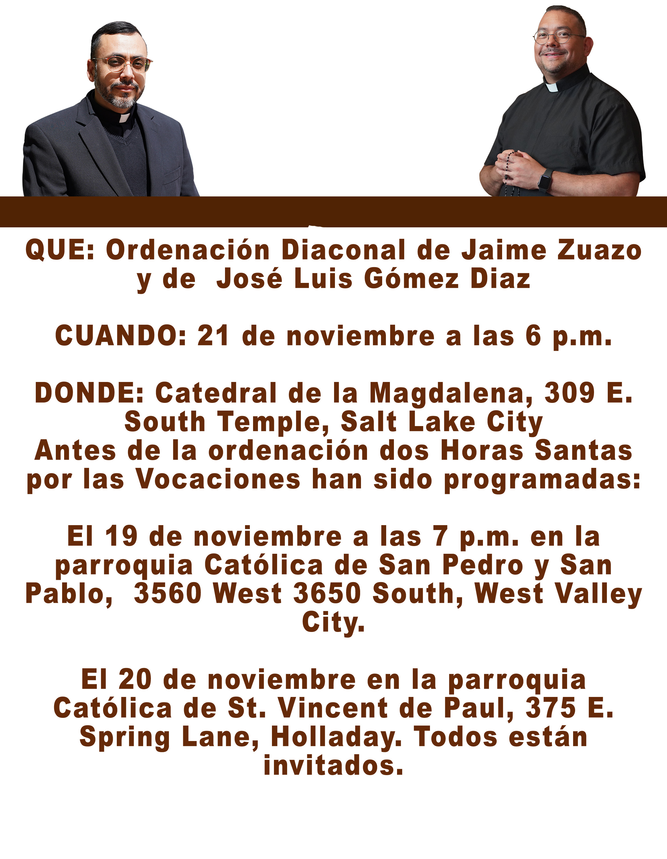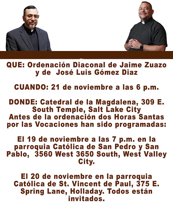 El 21 de noviembre Jaime Zuazo y José Luis Gómez Diaz serán ordenados al diaconado transitorio por el Obispo Oscar A. Solis durante una Misa a celebrarse en la Catedral de la Magdalena fortaleciéndolos con el Espíritu Santo para servir a la Iglesia.