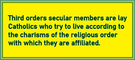 Third orders secular members are lay Catholics who try to live according to the charisms of the religious order with which they are affiliated; although they may take private vows, they do not profess public vows or live in community.